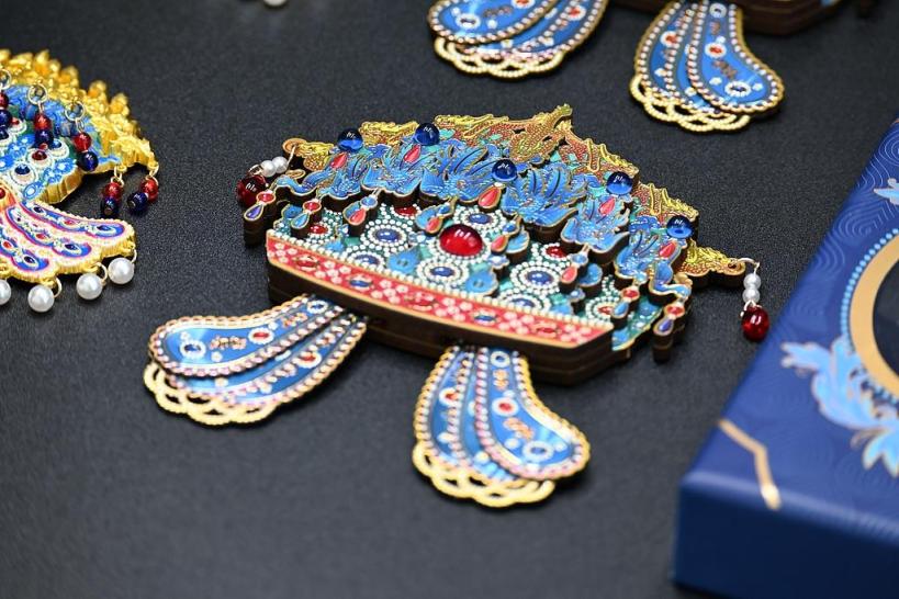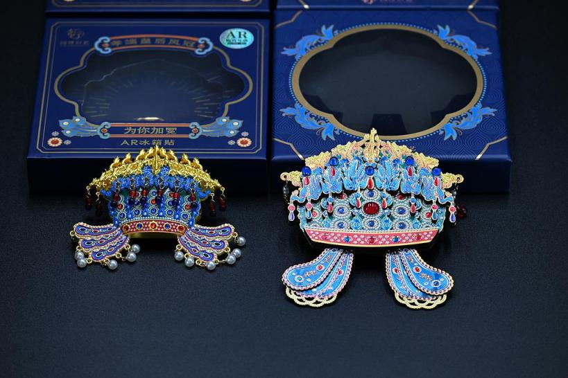 廖飞:这两款冰箱贴突出了工艺性,因为这件文物本身在当时就是工匠用了很多高超的技艺去做的。我们的木质冰箱贴分了三层,让它在平面上相对有一个立体感,从印刷到串珠装饰需要很多的手工部分。金属冰箱贴更是如此,在最底下有12个小的仿珍珠的小坠,这个需要用手工穿,9个凤头每个凤头上会穿一个珠串,这些全都需要大量的人工去做。我们也是想通过一个小的物件来反映出当时人们对待一件工艺品的用心。